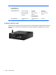 Memasang kembali bezel depan Masukkan keempat pengait di bagian bawah penutup ke dalam lubang persegi panjang pada chassis (1), lalu putar bagian atas bezel ke chassis (2) hingga terpasang dengan benar. Mengubah Konfigurasi dari desktop ke tower Komputer Berukuran Kecil dapat digunakan dalam posisi tegak dengan dudukan opsional yang dapat dibeli dari HP. 1. Lepaskan/buka semua perangkat pengaman yang menghalangi Anda untuk membuka komputer. 2.