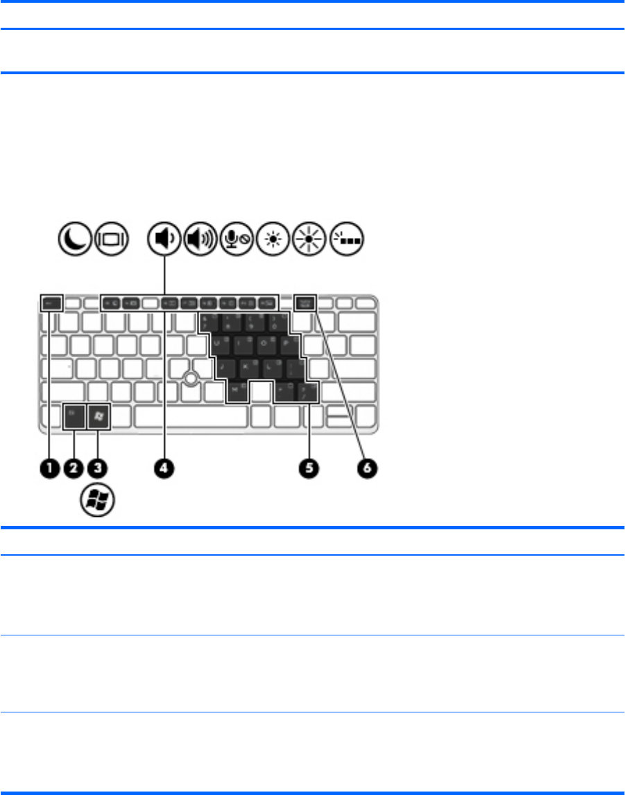 (6) num lk key Turns the embedded numeric keypad on and off when pressed in