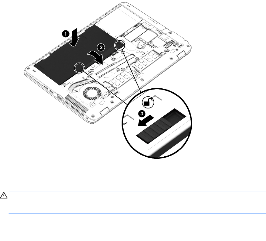 3. Inserte la batería en su compartimiento (1) y luego presione la batería (2) hacia abajo hasta que se