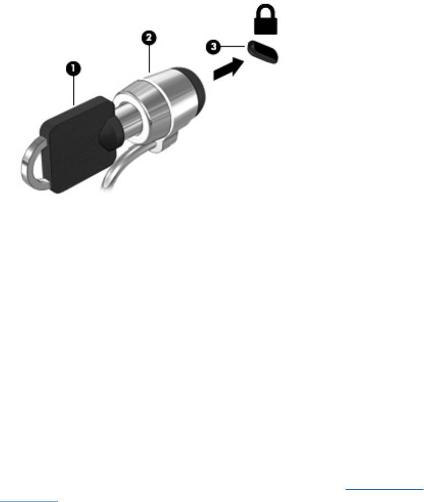 3. Inserte el candado con cable en la ranura para cable de seguridad del equipo (3) y cierre el candado con