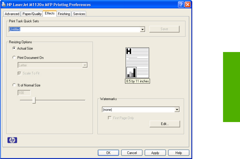 Use the Effects tab to create unique paper effects such as scaling and watermarks. The following