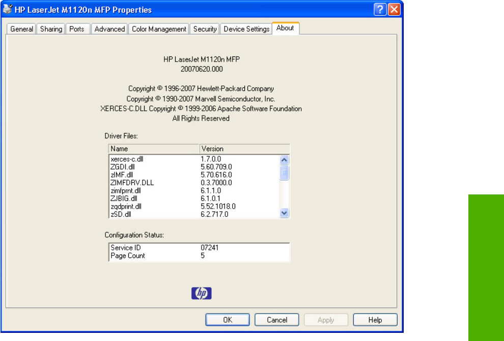 according to the HP LaserJet M1120 MFP Series model, driver, date, and version numbers. The