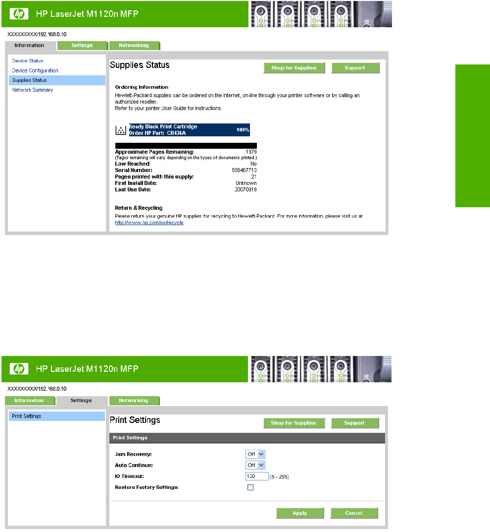 ENWW HP Embedded Web Server (HP LaserJet M1120n MFP only) 21