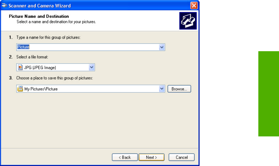 4. The Picture Name and Destination dialog box appears.