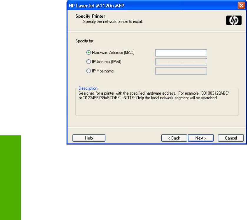 Click the appropriate option to specify a printer using the Hardware Address (MAC), the IP