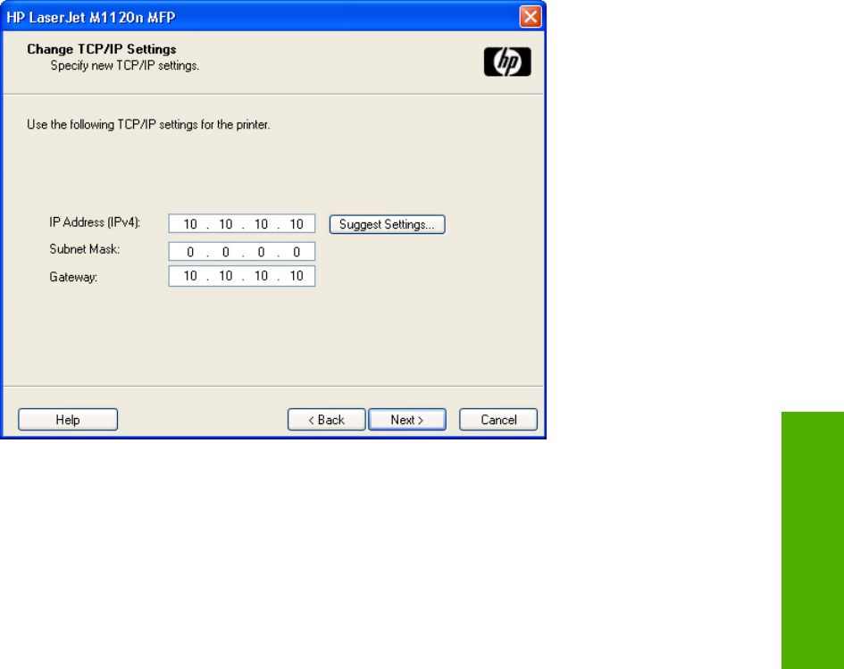 Change the settings in the IP Address (IPv4), Subnet Mask, or Gateway fields, or click Suggest