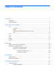 SIM 55 wireless certification 55 WLAN 55 latch, battery cover release 15 lights battery 12 caps lock 7 hard drive 11 power 7, 11 TouchPad 7 webcam 14 wireless 7 M Media Card Reader, identifying 13 memory module inserting 41 removing 40 replacing 40 microphone (audio-in) jack, identifying 12 Microsoft Certificate of Authenticity label 55 mouse, external setting preferences 27 N network jack, identifying 12 num lk key, identifying 26 O operating environment 58 operating system Microsoft Certificate of Authent