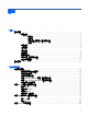 滑鼠, 外接式 設定偏好設定 27 連接 27 節省, 電力 56 裝置安全性 90 裝置組態 119 電力 連接 50 節省 56 電池 充電 52, 54, 56 存放 56 低電池電力 53 更換 57 取出 51 校正 54 處置 56 節省電力 56 裝入 51 識別 11 電池充電 52, 54 電池到達嚴重電力不足 53 電池指示燈 52, 53 電池指示燈, 識別 7 電池插槽 8, 12 電池溫度 56 電池電量, 延長 53 電池電源 50 電池釋放閂 8, 51 電源按鈕, 識別 4 電源指示燈, 識別 3 電源接頭, 識別 7 電源線, 識別 11 電腦設定 BIOS 管理員密碼 80 DriveLock 密碼 84 安全性功能表 117 系統組態功能表 118 系統診斷 (System Diagnostics) 功能表 118 啟用開機裝置 103 設定 MultiBoot Express 提 示 106 設定開機順序 105 裝置安全性 90 檔案功能表 117 還原出廠設定 116 瀏覽和選擇 115 電腦設定公用程式 107 124 索引 電腦資訊 98 電影, 觀賞 42