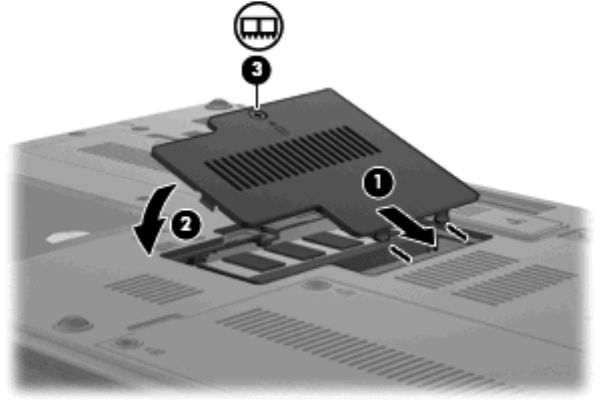 13. Draai de schroef van het afdekplaatje van het geheugenmodulecompartiment vast (3).