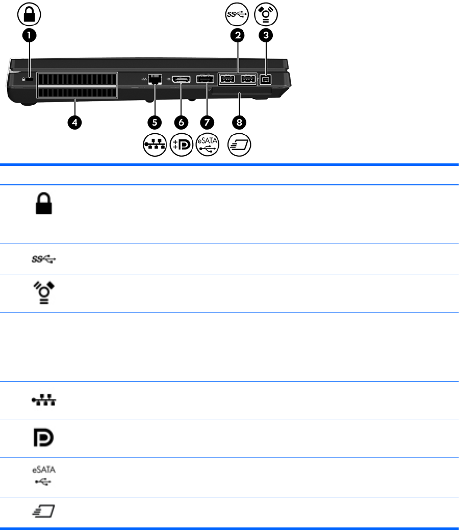 Stik til sikkerhedskabel Til tilslutning af et valgfrit sikkerhedskabel til computeren.