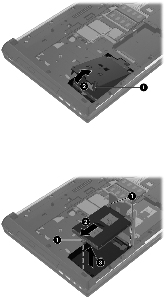 10. Brug plastiktappen til at løfte harddisken (3) og tage den ud af computeren.