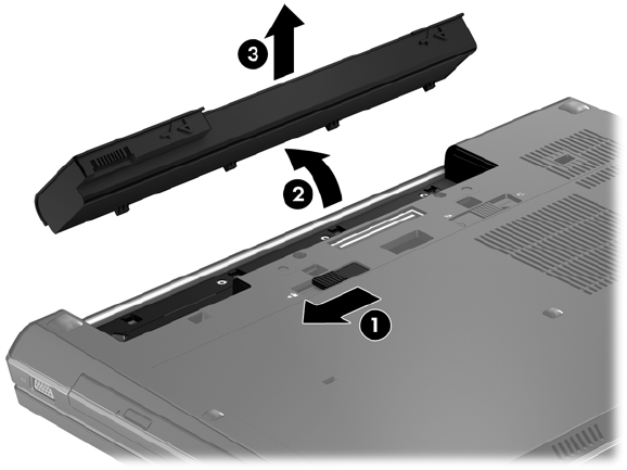 2. Remova a bateria do computador retirando e (2) levantado-a (3) do computador.