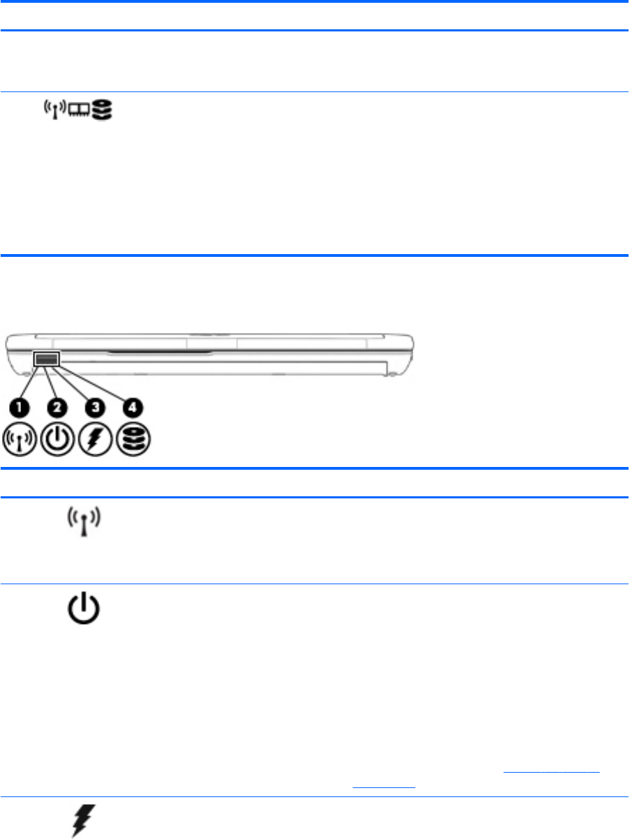 (1) 無線通訊指示燈 亮起:已開啟整合式無線裝置,例如無線區域網