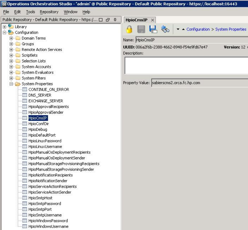Verify that the HpioCmsIP property is set to the IP address or the Fully Qualified Domain