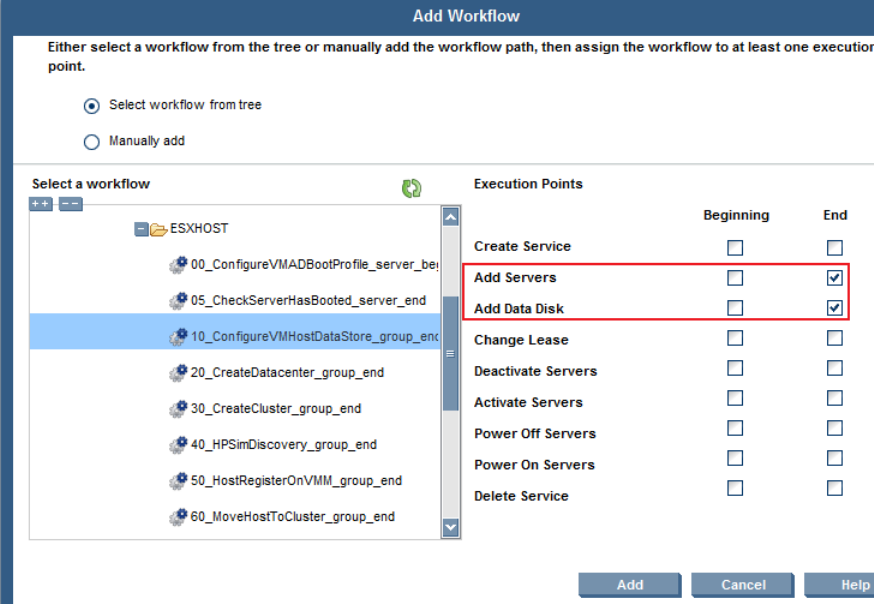 f. Select 50_HostRegisterOnVMM_group_end, click the Add Servers End and Add Data Disk
