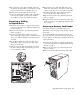 5 Disconnect the power cable and data cable from the back of the optical drive, using a gentle rocking motion. Disconnect the sound cable, if present. 6 Pull the drive out through the front of the PC. 7 If you are replacing the old drive with a new drive, remove the four guide screws from the old drive. You need these screws to install the new drive. Replacing or Adding an Optical Drive 1 Complete the procedures to prepare the PC and to remove the side panel. See “Opening and Closing the PC” on page 1.