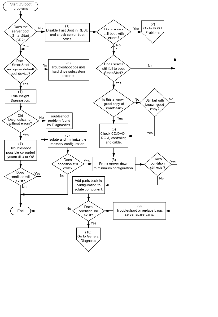 • Server boots, but the internal health LED, external health LED, or component health LED is red or amber