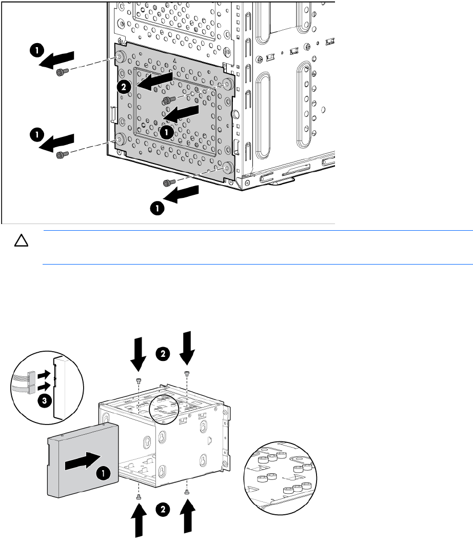 6. Using four of the surplus T-15 screws located on the non-hot-plug hard drive expansion cage, install the