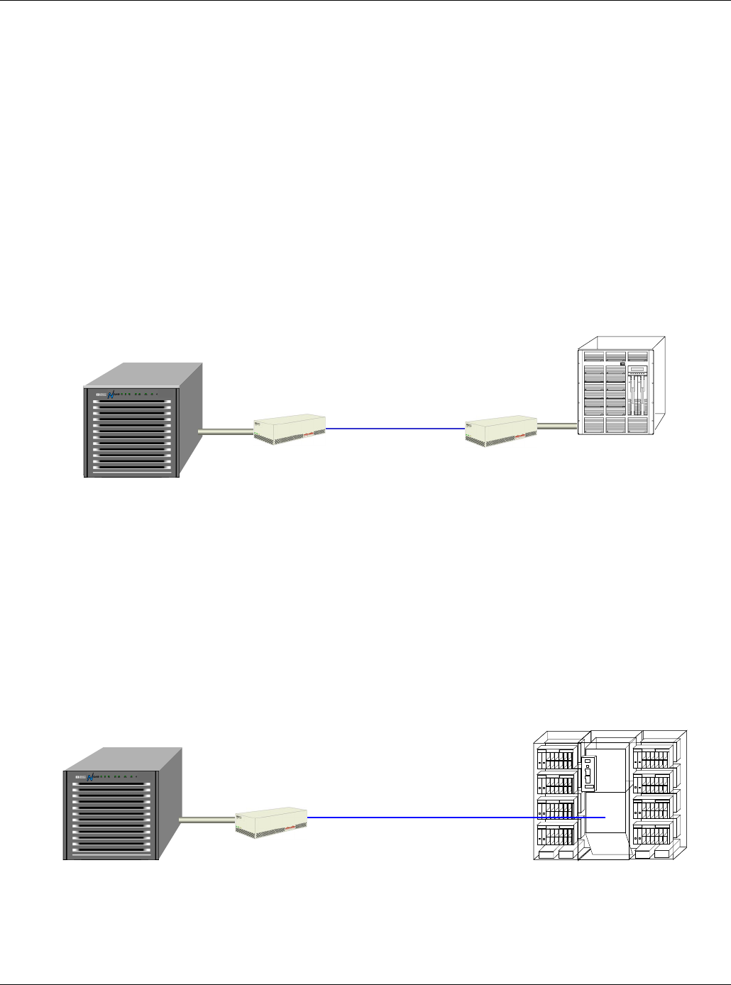 As is shown in Figure 1-2, SCSI-FC Routers as a Distance Solution, the connection between the