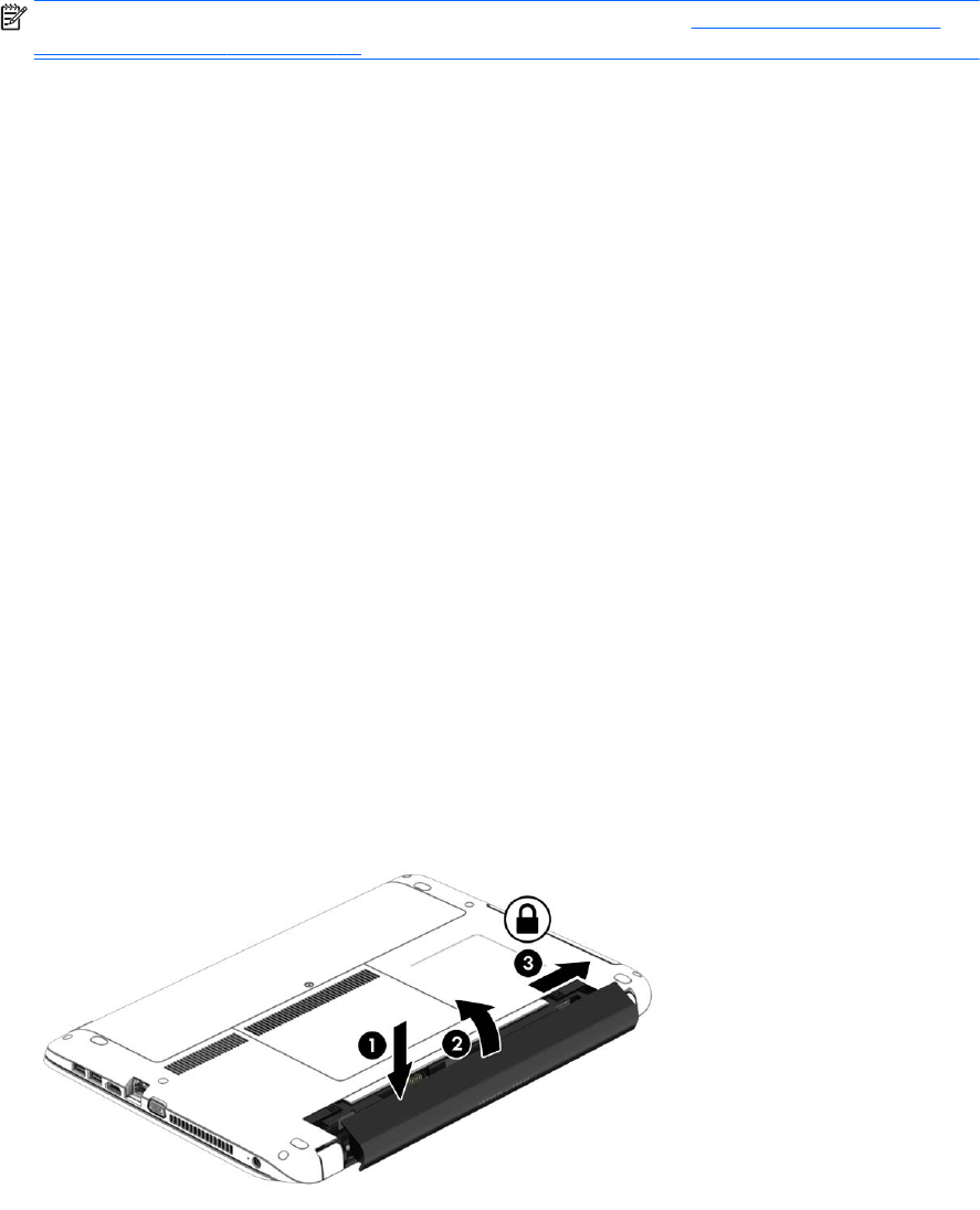 2. Vložte baterii do bateriové pozice a zarovnejte její výstupky (1) se západkami na počítači.