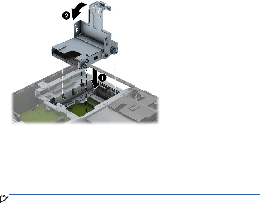 어를 드라이브 베이에 수직으로 넣은 다음 (1) 캐리어의 핸들을 아래로 눌러 (2) 드라이브가 제대