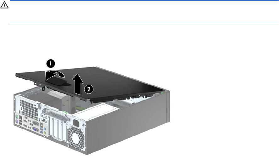6. 액세스 패널 핸들을 위로 올린 후 (1) 컴퓨터에서 액세스 패널을 들어 올려 분리합니다 (2).