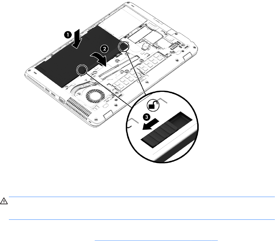 3. Insert the battery (1) into the battery bay at an angle and then press down on the battery (2) until it is