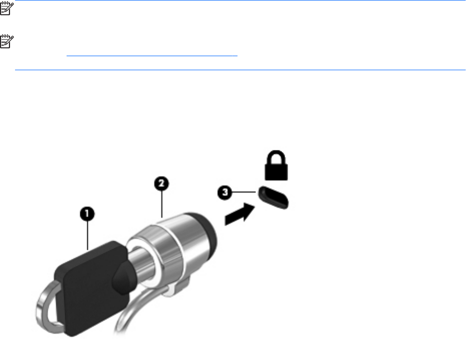3. Insert the cable lock into the security cable slot on the computer (3), and then lock the cable lock with