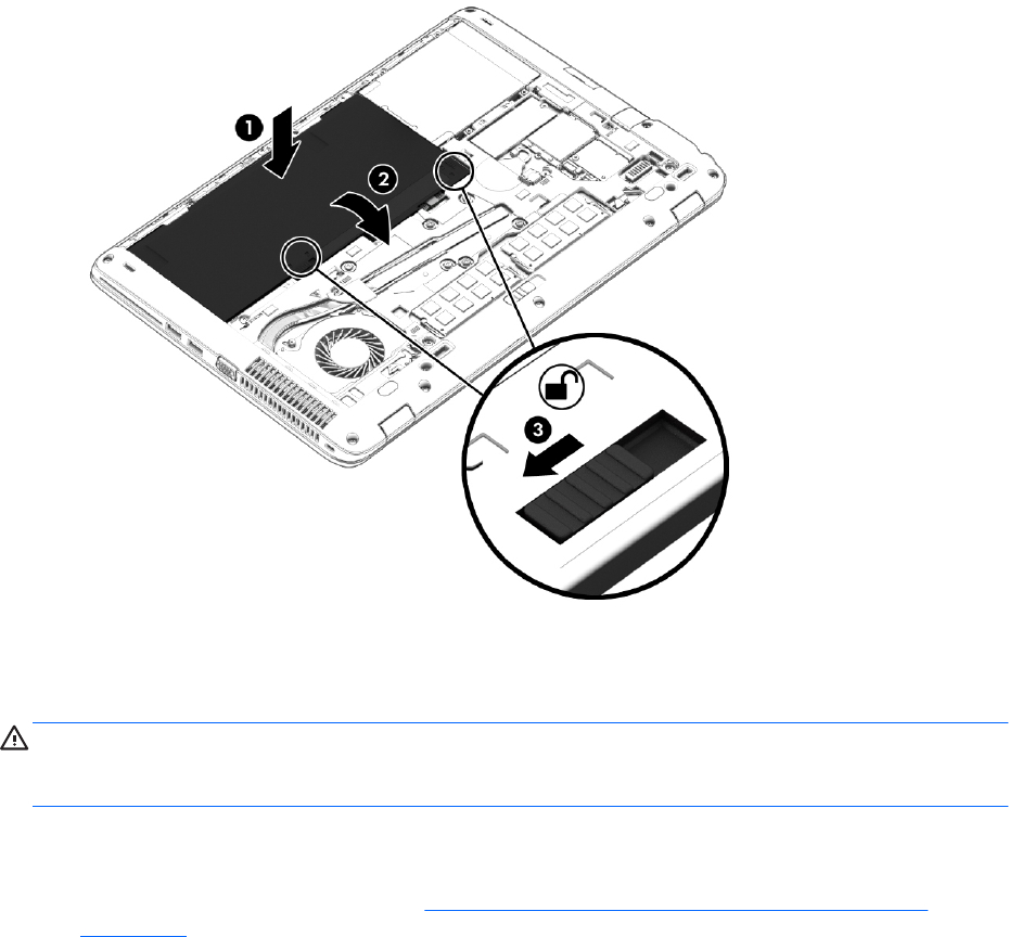 3. Setzen Sie den Akku (1) schräg in das Akkufach ein und drücken Sie den Akku (2) dann nach unten, bis er
