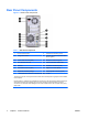Rear Panel Components Figure 1-4 Rear Panel Components Table 1-3 Rear Panel Components 1 Power Cord Connector 8 PS/2 Mouse Connector (green) 2 Voltage Select Switch 9 Line-Out Connector for powered audio devices (green) 3 Line-In Audio Connector (blue) 10 Microphone Connector (pink) 4 RJ-45 Network Connector 11 Universal Serial Bus (USB) Ports 5 1394 Port 12 DVI Monitor Connector (white) 6 VGA Monitor Connector (blue) 13 Digital Line-In Audio (black) 7 Digital Line-Out Audio (orang