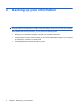 Backup suggestions ● Create a set of recovery discs using HP Backup & Recovery Manager. ● Create system recovery points using HP Backup & Recovery Manager, and periodically copy them to disc. ● Store personal files in the Documents folder and back up these folders periodically. ● Back up templates stored in their associated programs. ● Save customized settings in a window, toolbar, or menu bar by taking a screen shot of your settings.