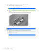 메모리 모듈 추가 또는 교체 이 컴퓨터는 밑면에 한 개의 메모리 모듈함이 있습니다. 메모리 모듈 슬롯에 있는 기존 메모리 모듈을 교체하여 컴퓨터의 메모리 용량을 업그레이드할 수 있습니다. 경고! 감전 위험이나 장비 손상을 줄이려면 메모리 모듈을 설치하기 전에 전원 코드를 뽑고 모든 배 터리를 분리하십시오. 주의: 정전기 방전(ESD)으로 인해 전자 부품이 손상될 수 있습니다. 절차를 시작하기 전에 접지된 금 속 물체를 만져 정전기를 방전하십시오. 메모리 모듈을 추가 또는 교체하려면 다음과 같이 하십시오. 1. 작업 내용을 저장합니다. 2. 컴퓨터를 종료하고 디스플레이를 닫습니다. 컴퓨터가 꺼져 있는지 아니면 최대 절전 모드 상태인지 확실하지 않은 경우에는 전원 버튼을 눌 러 컴퓨터를 켠 다음 운영 체제의 절차에 따라 정상적으로 컴퓨터를 종료합니다. 3. 컴퓨터에 연결된 모든 외장 장치를 분리합니다. 4. AC 콘센트에서 전원 코드를 뽑습니다. 5.