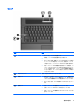 ランプ 名称 (1) 説明 バッテリ ランプ ● オレンジ色:バッテリが充電中です ● 青緑色:バッテリが完全充電時に近い状態です ● オレンジ色で点滅:電源にバッテリのみを使用している状態 で、ロー バッテリ状態になっています。完全なロー バッテ リ状態になると、バッテリ ランプがすばやく点滅し始めます ● 消灯:コンピュータが外部電源に接続されている場合は、コ ンピュータのすべてのバッテリが完全に充電されるとバッテ リ ランプが消灯します。コンピュータが外部電源に接続され ていない場合は、ロー バッテリ状態になるまでランプが消灯 したままになります (2) Caps Lock ランプ 点灯:Caps Lock がオンになっています (3) 無線ランプ ● 青色に点灯:無線ローカル エリア ネットワーク(無線 LAN) デバイス、HP ブロードバンド無線モジュール、Bluetooth®デ バイスなどの内蔵無線デバイスの電源がオンになっています ● オレンジ色に点灯:すべての無線デバイスがオフになってい ます ● 点灯:コンピュータの電源がオンになっています ●