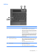 Klávesy Komponenta Popis (1) Klávesa esc Při stisknutí v kombinaci s klávesou fn zobrazí informace o systému. (2) Klávesa fn Stisknutím v kombinaci s funkční klávesou nebo klávesou esc lze vykonat často používané systémové funkce. (3) logo Windows, klávesa Zobrazí nabídku Start systému Windows. (4) Windows, klávesa aplikací Zobrazí místní nabídku položky, na které je umístěn ukazatel. (5) Integrovaná číselná klávesnice Lze ji používat stejně jako klávesy externí číselné klávesnice.