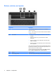 Buttons, switches, and speaker Component Description (1) Turns the wireless feature on or off but does not establish a wireless connection. Wireless button NOTE: You must set up or access a wireless network to establish a wireless connection. (2) Power button ● When the computer is off, press the button to turn on the computer. ● When the computer is on, press the button to initiate Hibernation. ● When the computer is in the Sleep state, press the button briefly to exit Sleep.