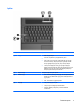 Işıklar Bileşen (1) Açıklama Pil ışığı ● Sarı: Pil şarj ediliyor. ● Türkuaz: Pil paketi tam şarj kapasitesine yakın. ● Sarı renkli yanıp sönüyorsa: Kullanılabilir tek güç kaynağı durumunda olan pil, düşük pil düzeyine gelmiştir. Pil kritik düzeye geldiğinde pil ışığı hızla yanıp sönmeye başlar. ● Yanmıyorsa: Bilgisayar harici güç kaynağına bağlıysa, bilgisayardaki tüm piller tam olarak şarj olduğunda ışık söner.