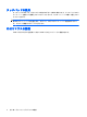1 ポインティング デバイスの使用 名称 説明 (1) タッチパッド* ポインタを移動して、画面上の項目を選択したり、アクティブに したりします (2) 左のタッチパッド ボタン* 外付けマウスの左ボタンと同様に機能します (3) 右のタッチパッド ボタン* 外付けマウスの右ボタンと同様に機能します (4) タッチパッドのスクロール ゾーン 画面を上下にスクロールします *この表では初期設定の状態について説明しています。タッチパッドの設定を表示したり変更したりするには、[スタート]→ [コントロール パネル]→[プリンタとその他のハードウェア]→[マウス]の順に選択します。 注記: プリロードされているソフトウェアをハードドライブからインストールするには、[スター ト]→[すべてのプログラム]→[HP Software Setup](HP ソフトウェア セットアップ)の順に選択し てから、画面の説明に沿って操作します。 ポインティング デバイス機能のカスタマイズ ボタンの構成、クリック速度、ポインタ オプションのような、ポインティング デバイスの設定をカ スタマイズするには