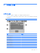 1 포인팅 장치 사용 구성 설명 (1) 터치패드* 포인터를 움직여서 화면에 표시된 항목을 선택하거나 활성화합니 다. (2) 왼쪽 터치패드 버튼* 외장 마우스의 왼쪽 버튼과 같은 기능을 수행합니다. (3) 오른쪽 터치패드 버튼* 외장 마우스의 오른쪽 버튼과 같은 기능을 수행합니다. (4) 터치패드 스크롤 영역 위쪽 또는 아래쪽으로 스크롤합니다. *이 표에서는 기본 설정에 대해 설명합니다. 터치 패드 기본 설정을 확인하거나 변경하려면 시작 > 제어판 > 하드웨어 및 소 리 > 마우스를 차례로 선택합니다. 주: 하드 드라이브에서 사전 로드된 소프트웨어를 설치하려면 시작 > 프로그램 > HP Software Setup 을 선택한 다음 화면 지침을 따르십시오. 포인팅 장치 기본 설정 지정 Windows®의 마우스 속성을 사용하여 버튼 구성, 마우스를 누르는 속도, 포인터 옵션과 같은 포인팅 장치에 대한 설정을 사용자 정의합니다.