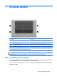 1 Använda pekdon Komponent Beskrivning (1) Styrplatta* Flyttar pekaren och väljer eller aktiverar objekt på skärmen. (2) Vänster knapp på styrplattan* Fungerar som vänsterknappen på en extern mus. (3) Höger knapp på styrplattan* Fungerar som högerknappen på en extern mus. (4) Styrplattans rullningsområde För rullning uppåt och nedåt. *I den här tabellen beskrivs standardinställningarna.