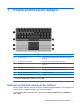 5 Používání klávesnice Počítač je vybaven integrovanou číselnou klávesnicí, podporuje však i připojení externí klávesnice s číselnými klávesami. Komponenta Popis (1) Klávesa fn Stisknutím v kombinaci s funkční klávesou nebo klávesou esc lze vykonat často používané systémové funkce. (2) Indikátor Num Lock Svítí: Funkce Num Lock je zapnutá. (3) Klávesa num lk Umožňuje použití vestavěné numerické klávesnice při stisknutí v kombinaci s klávesou fn.