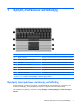 - 1 Χρήση συσκευών κατάδειξης Στοιχείο Περιγραφή (1) Μοχλός κατάδειξης Μετακινεί το δείκτη και επιλέγει ή ενεργοποιεί στοιχεία στην οθόνη. (2) Αριστερό κουμπί μοχλού κατάδειξης Λειτουργεί όπως το αριστερό κουμπί ενός εξωτερικού ποντικιού. (3) TouchPad* Μετακινεί το δείκτη και επιλέγει ή ενεργοποιεί στοιχεία στην οθόνη. (4) Αριστερό κουμπί TouchPad* Λειτουργεί όπως το αριστερό κουμπί ενός εξωτερικού ποντικιού.