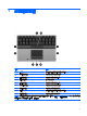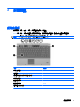 1 使用指標裝置 組件 說明 (1) 指標桿 移動指標,並選擇或啟動螢幕上的項目。 (2) 中央指標桿按鈕 功能類似外接式滑鼠的中間鍵。 (3) 右指標桿按鈕 功能類似外接式滑鼠的右鍵。 (4) 觸控板捲軸區 向上或向下捲動。 (5) 右觸控板按鈕 功能類似外接式滑鼠的右鍵。 (6) 中央觸控板按鈕 功能類似外接式滑鼠的中間鍵。 (7) 左觸控板按鈕 功能類似外接式滑鼠的左鍵。 (8) 觸控板 移動指標,並選擇或啟動螢幕上的項目。 (9) 左指標桿按鈕 功能類似外接式滑鼠的左鍵。 附註: 本表格說明原廠設定。若要檢視或變更指標裝置偏好設定,請選取「開始」>「裝置及印表機」。然後,在代表您電腦 的裝置上按一下滑鼠右鍵,並選取「滑鼠設定」。 1