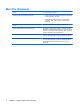 Meni Diagnostics (Diagnostika) 8 Izberite Če želite narediti naslednje Meni System Diagnostics (Diagnostika sistema) ● Poglavje 3 Meniji programa Computer Setup F1 Informacijski zasloni sistema – prikazujejo naslednje informacije: ◦ informacije o identifikaciji računalnika in akumulatorjev v sistemu. ◦ specifikacijski podatki o procesorju, predpomnilniku in velikosti pomnilnika, pomnilniku ROM, video reviziji in različici krmilnika tipkovnice.