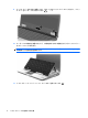 17. キーボードを元に戻します。 18. スイッチ カバーの 4 か所を下方向に押して(1)スイッチ カバーのフックをはめ込んでから、ス イッチ カバーを左方向にスライドさせます(2)。 注記: スイッチ カバーのどこかが盛り上がっていたりして平らでない場合は、カバーをいっ たん取り外し、この手順の操作をもう一度行います。 19.