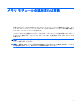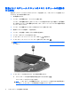 メモリ モジュールの追加または交換 お使いのコンピュータには 2 か所にメモリ モジュール コンパートメントが装備されています。メイ ン メモリ モジュール コンパートメントはキーボードの下にあります。コンピュータの裏面に拡張メ モリ モジュール コンパートメントがあります。 コンピュータのメモリ容量をアップグレードするには、メモリ モジュールを空の拡張メモリ モジュー ル スロットに追加するか、メイン メモリ モジュール スロットに装着されているメモリ モジュールを 交換します。 警告! 感電や装置の損傷を防ぐため、電源コードとすべてのバッテリを取り外してからメモリ モ ジュールを取り付けてください。 注意: 静電気(ESD)によって電子部品が損傷することがあります。作業を始める前に、アースさ れた金属面に触るなどして、身体にたまった静電気を放電してください。 1