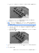 拡張メモリ モジュール スロットのメモリ モジュールの追加ま たは交換 拡張メモリ モジュール スロットのメモリ モジュールを追加したり、メモリ モジュールを交換したり するには、以下の手順で操作します。 1. 作業を保存します。 2. コンピュータの電源を切り、ディスプレイを閉じます。 コンピュータの電源が切れているかハイバネーション状態なのかわからない場合は、まず電源ボ タンを押してコンピュータの電源を入れます。次に、オペレーティング システムの通常の手順 でシャットダウンします。 3. コンピュータに接続されているすべての外付けデバイスを取り外します。 4. 電源コンセントから電源コードを抜きます。 5. コンピュータを裏返して安定した平らな場所に置きます。 6. コンピュータからバッテリを取り外します。 7. メモリ モジュール コンパートメント カバーのネジ(1)を緩めます。 8.
