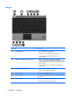 Lampjes Onderdeel Beschrijving (1) ● Aan: de computer is ingeschakeld. ● Knipperend: de computer staat in de slaapstand. ● Uit: de computer is uitgeschakeld of staat in de hibernationstand. ● Blauw: een geïntegreerd apparaat voor draadloze communicatie, zoals een draadloosnetwerkadapter, de HP draadloosbreedbandmodule en/of een Bluetooth®-apparaat, is ingeschakeld. ● Oranje: alle apparatuur voor draadloze communicatie is uitgeschakeld. ● Turkoois: het touchpad is ingeschakeld.