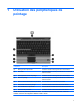 1 Utilisation des périphériques de pointage Composant Description (1) Bouton gauche du pavé tactile* Fonctionne comme le bouton gauche d'une souris externe. (2) Pavé tactile* Permet de déplacer le curseur pour sélectionner ou activer des éléments à l'écran. (3) Touche gauche du bouton de pointage* Fonctionne comme le bouton gauche d'une souris externe. (4) Bouton de pointage* Permet de déplacer le curseur pour sélectionner ou activer des éléments à l'écran.