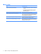 Menyn Diagnostik 8 Välj För att göra det här Menyn System Diagnostics (Systemdiagnostik) ● Kapitel 3 Menyer i Setup-hjälpprogrammet F1 Systeminformation – Följande information visas: ◦ Identifieringsinformation för datorn och batterierna i systemet. ◦ Specifik information för processorn, cacheminnet och minnesstorlek, system-ROM, bildskärmskort och tangentbordsstyrenhet. ● F2 Starttest – Verifierar de systemkomponenter som behövs för att starta datorn.