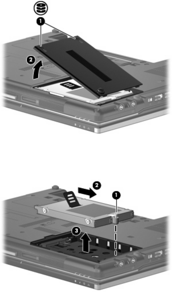 10. Pociągnij klapę dysku twardego (2) w prawo, aby go odłączyć.